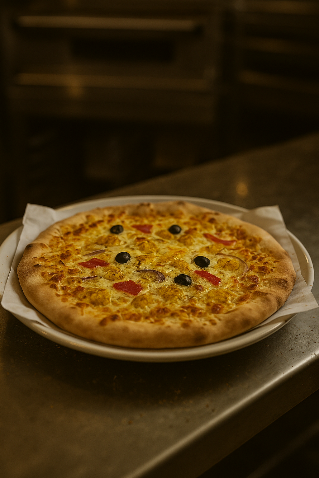 Base Blanche/Rouge – Mozza, Emmental, Poulet mariné, Poivrons, Oignons, Olives